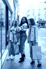Three diverse women friends holding shopping bags while looking at a store window on a city street