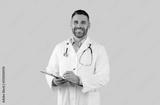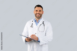 Happy middle aged man doctor in white coat with stethoscope, holding clipboard and smiling at camera, posing on grey background. Medical service, examination with therapist, prescription