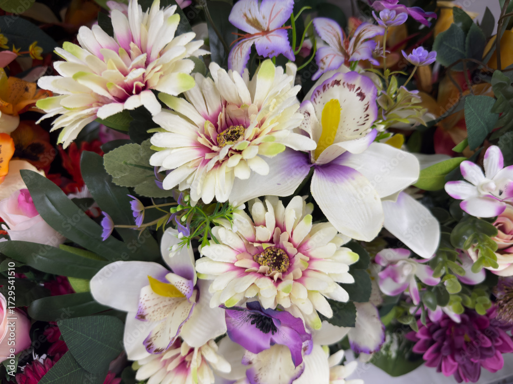 Vibrant bouquet of artificial silk flowers featuring white, pink, and purple blossoms