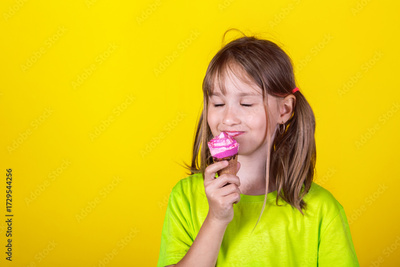 Happy little blonde girl eating ice cream against yellow background. Studio shot.
