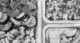 Healthy food background. Take away of natural organic meals in foil boxes. Fitness nutrition, meat, vegetables and fruits. Top view, flat lay. Restaurant dishes delivery