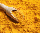 Wooden scoop with yellow turmeric powder closeup, abstract grocery background