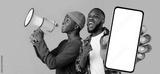 Black Males With Megaphone In Hands Making Announcement And Showing Blank Smartphone At Camera, Cheerful Young African American Men Recommending New Mobile App Or Website, Collage, Mockup