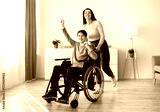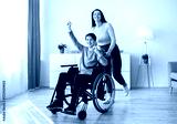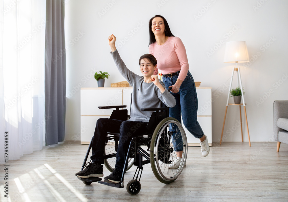 Cool young mom and her disabled son in wheelchair having fun at home, full length. Cheerful family with mother and impaired teen boy playing, being silly indoors. Parent child pastimes concept