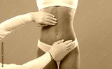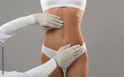 Body Sculpting Concept. Unrecognizable Young Female Getting Consultation At Plastic Surgery Clinic, Doctor In Gloves Examining Abdomen Area Of Woman In Underwear Before Treatment, Cropped