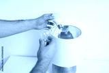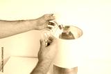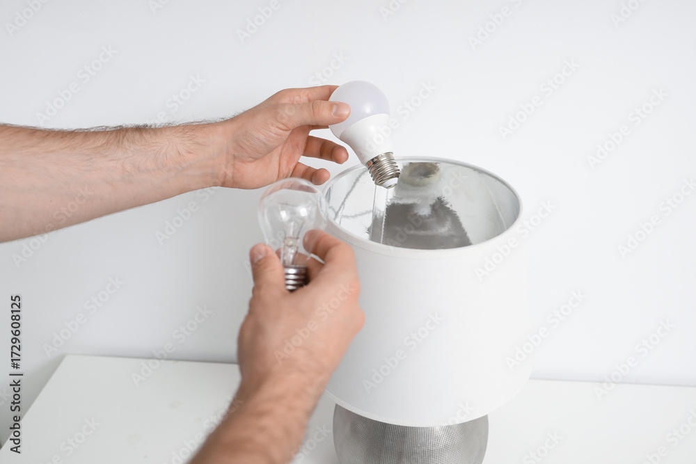 Man changing incandescent light bulb for fluorescent one in lamp on white table, closeup