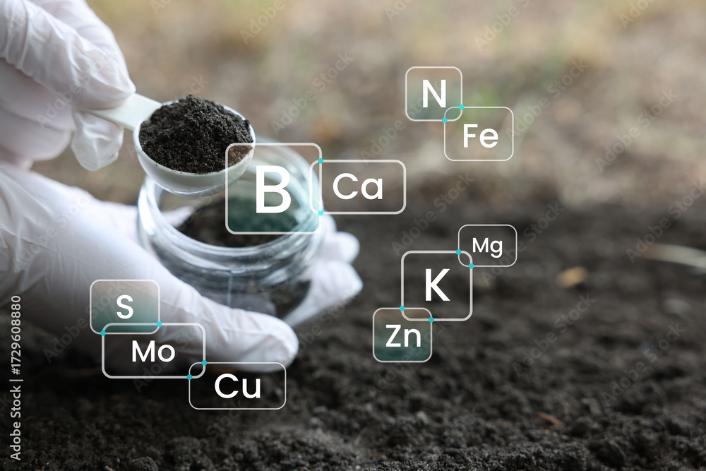 Scientist taking sample of soil for research outdoors, closeup. Chemical elements around. Composition analysis