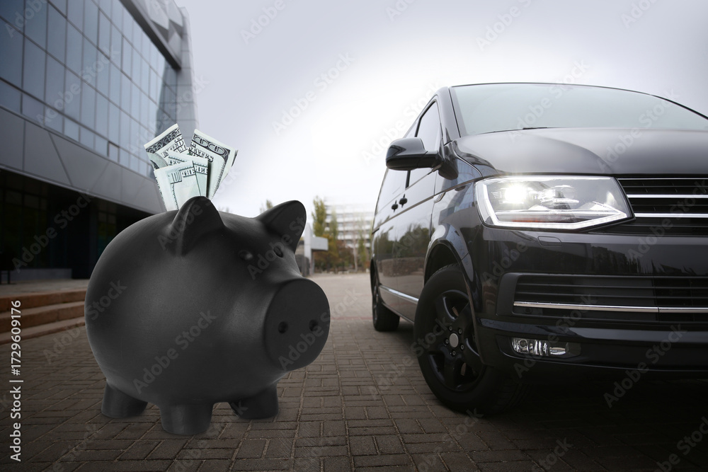 Save money for car. Black piggy bank with dollars near automobile outdoors