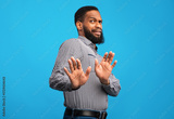 Ew, It's So Gross. Young african man with disgusted expression repulsing something, saying please stop, blue wall