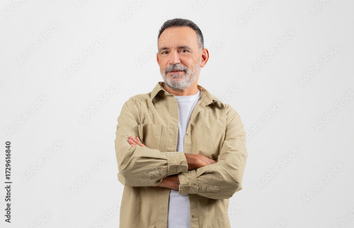 Portrait of confident senior man in casual clothes posing with folded arms, handsome elderly gentleman standing isolated on white studio background, smiling and looking at camera, copy space