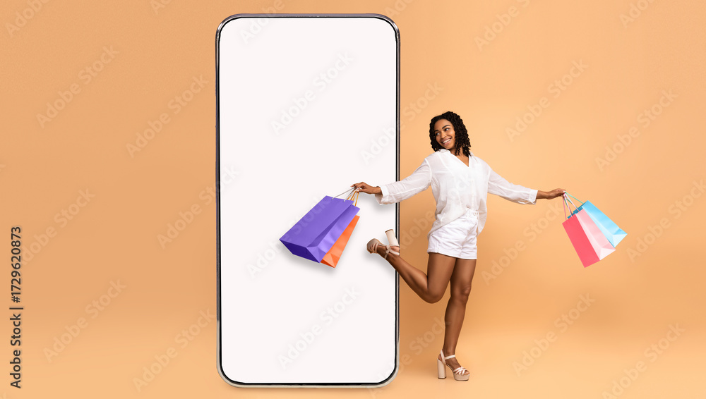 Cheerful Black Female Customer Holding Shopping Bags Coming Walking Out Empty Cell Phone Screen Over Studio Background, Joyful Millennial Lady Enjoying Seasonal Sales And Discounts, Banner, Copy Space