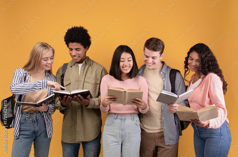 Joint study and preparation for exams or tests and teamwork. Modern busy cheerful young multiracial students reading books and abstracts, isolated on orange background, copy space, studio shot