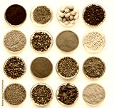 Big assortment of condiments in glass bowls collage isolated on white background, top view