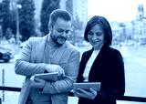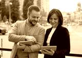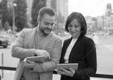 Businesspeople using a tablet computer in the city. A businessman and businesswoman consult, plan, discuss, and use a tablet.