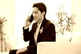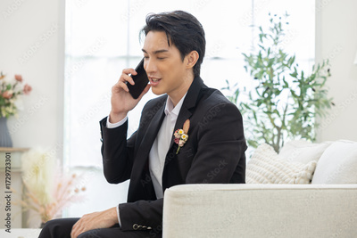 Asian Young man talking on phone, sitting on sofa, wearing black suit with boutonniere, indoor living room with plants and soft natural light, casual conversation mood