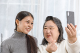 Asian Two women smiling and taking selfie together indoors, showing affection and happiness in bright room with sheer curtains
