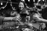 Party and celebration concept, Holidays summer, Group of friends clinking glasses wine on outdoor at night party.