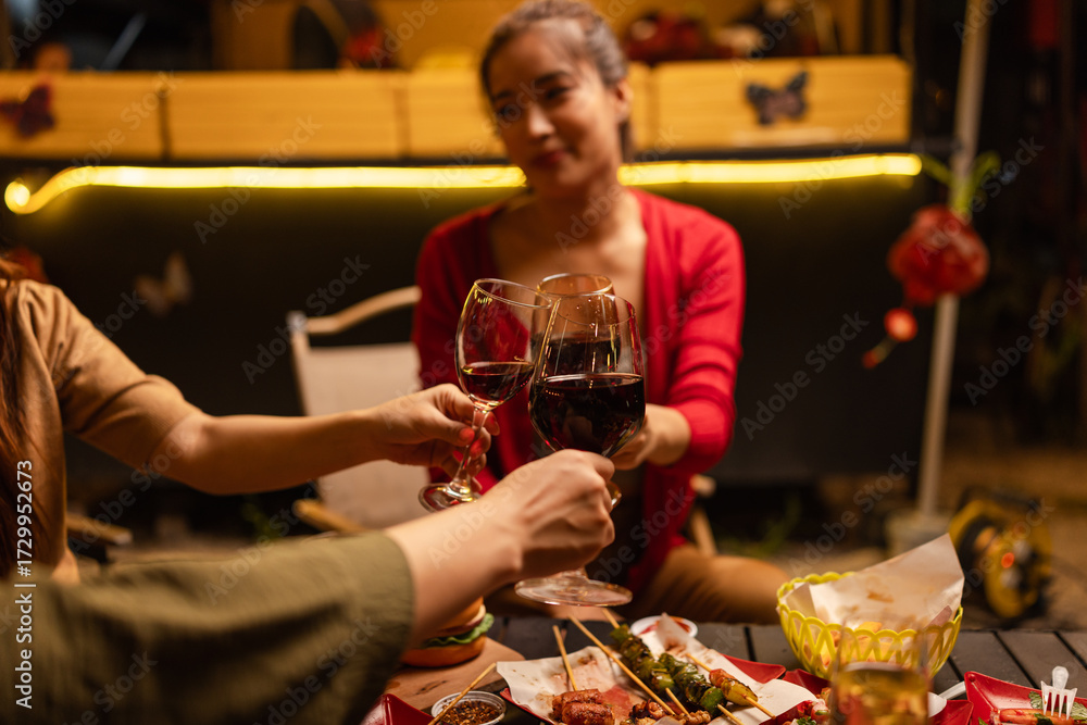 Party and celebration concept, Holidays summer, Group of friends clinking glasses wine on outdoor at night party.
