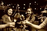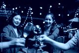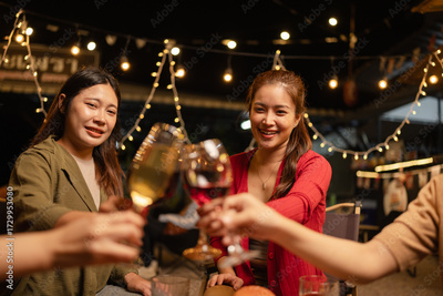 Party and celebration concept, Holidays summer, Group of friends clinking glasses wine on outdoor at night party.