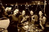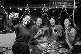 Happy Group of Woman Friends Celebrating Together at Night, Сlinking glasses of dinner at a social gathering.