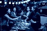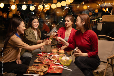 Happy Group of Woman Friends Celebrating Together at Night, Сlinking glasses of dinner at a social gathering.