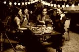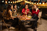Happy Group of Woman Friends Celebrating Together at Night, Сlinking glasses of dinner at a social gathering.