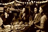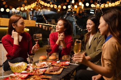 Happy Group of Woman Friends Celebrating Together at Night, Сlinking glasses of dinner at a social gathering.
