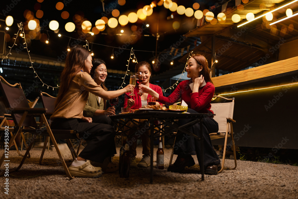 Happy Group of Woman Friends Celebrating Together at Night, Сlinking glasses of dinner at a social gathering.