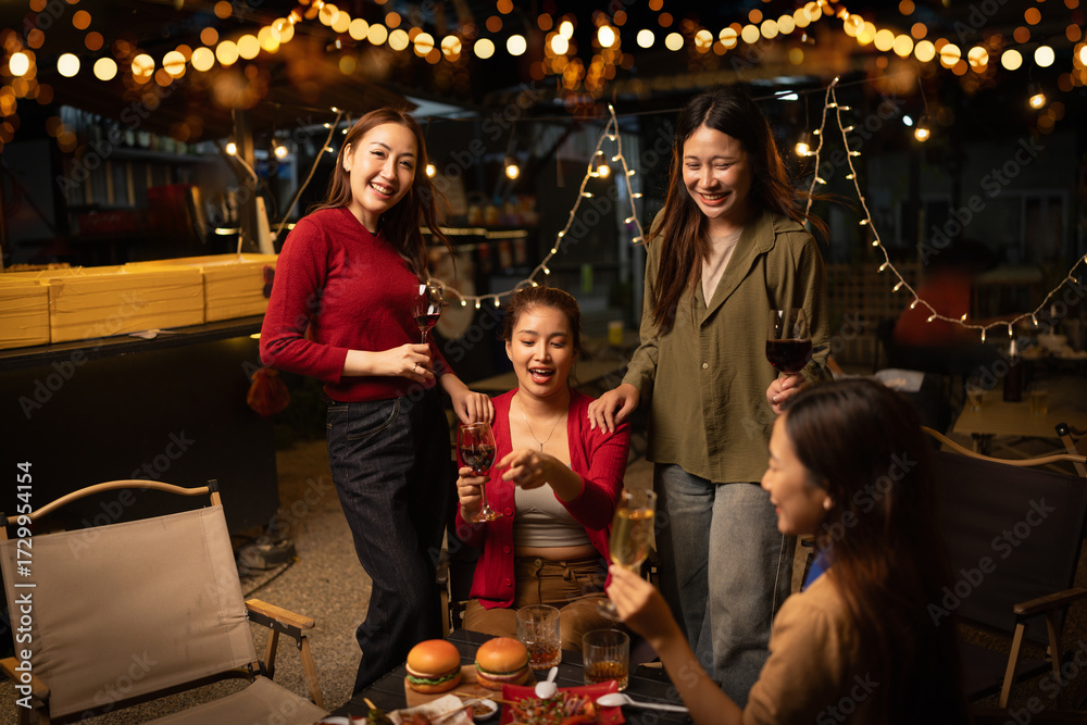 Happy Group of Woman Friends Celebrating Together at Night, Сlinking glasses of dinner at a social gathering.