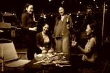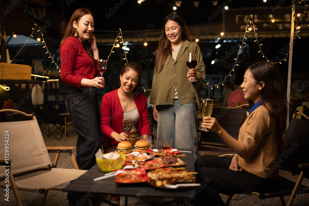 Happy Group of Woman Friends Celebrating Together at Night, Сlinking glasses of dinner at a social gathering.