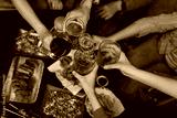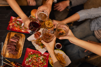 Party and celebration concept, Holidays summer, Group of friends clinking glasses with wine on outdoor at night party.