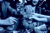 Party and celebration concept, Holidays summer, Group of friends clinking glasses with wine on outdoor at night party.