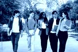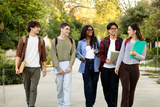 Happy students walking and talking on campus