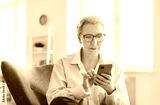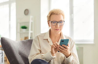 Portrait of confident senior woman wearing casual clothes sitting on chair in the living room at home holding mobile phone in hands. Elderly female person using social network internet technology.