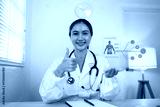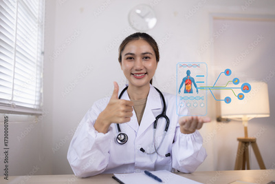 Medical professional interacting with a futuristic interface showing patient health data.