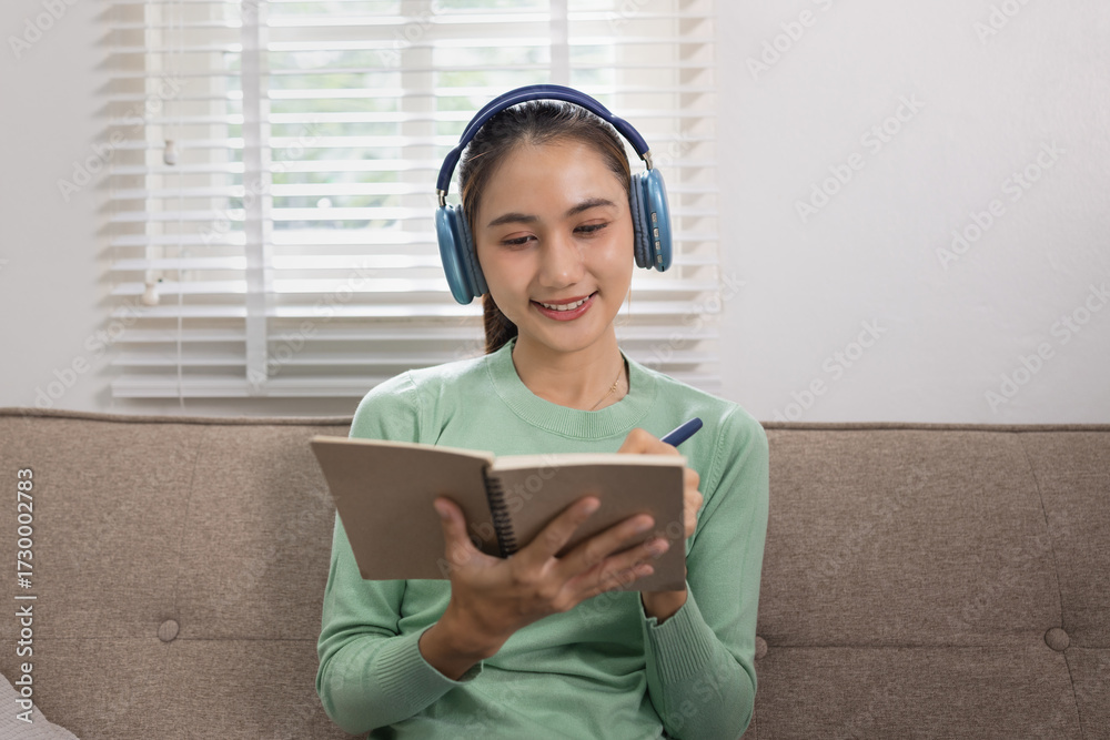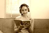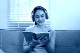 Woman reading a book with blue headphones and a laptop at home, Relaxation & Leisure Learn online Concept.