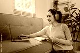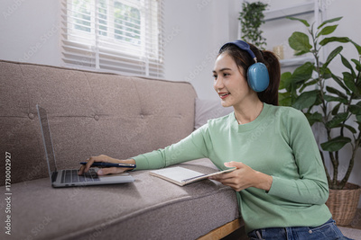 Woman reading a book with blue headphones and a laptop at home, Relaxation & Leisure Learn online Concept.