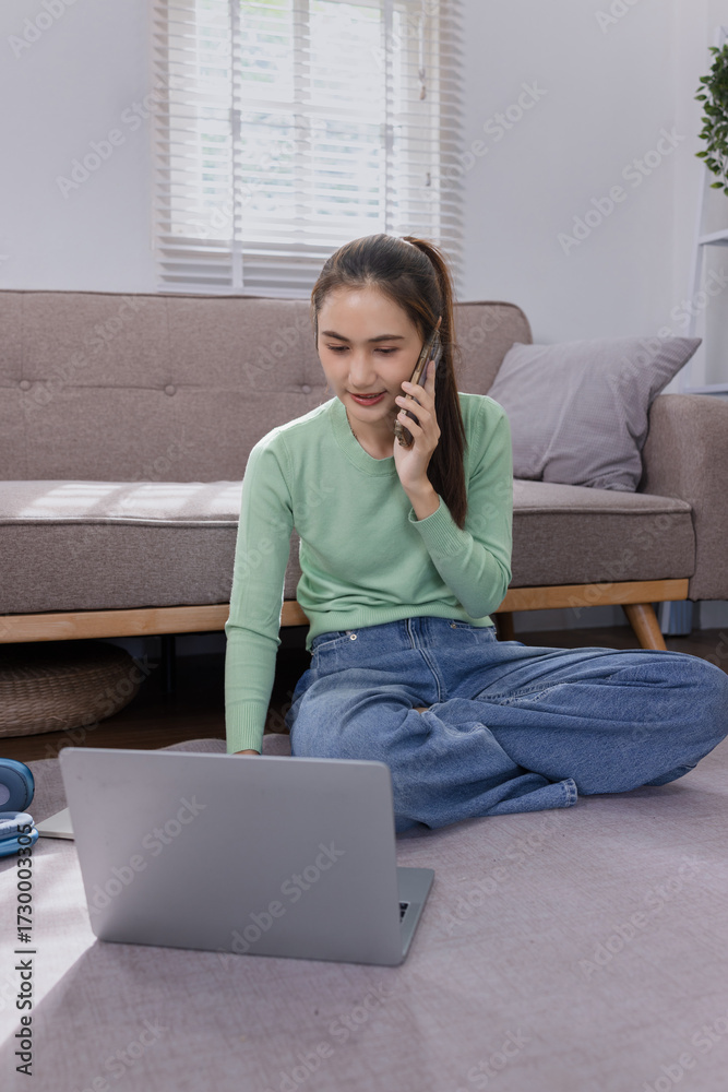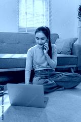 Woman reading a book with blue headphones and a laptop at home, Relaxation & Leisure Learn online Concept.