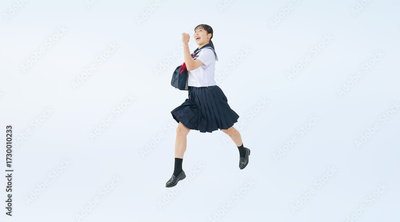 ジャンプするセーラー服を着た女子学生の切り抜き全身写真