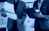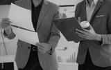 Hand of business team holding a pen, discussing marketing analytics at the office.