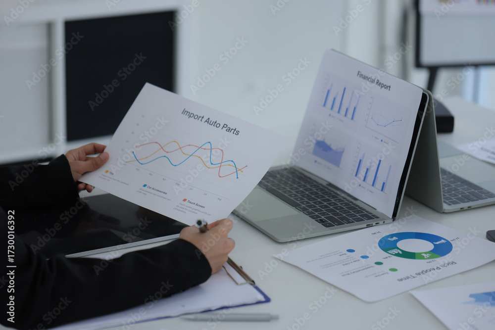 Hand of business team holding a pen, discussing marketing analytics at the office.