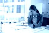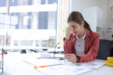 Stressed businesswoman overwhelmed with work and deadlines at the office.