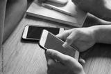 group of people holding a smartphone with both hands, with a dark screen displaying, network connections visualized