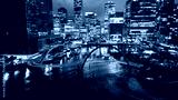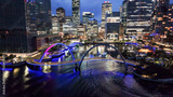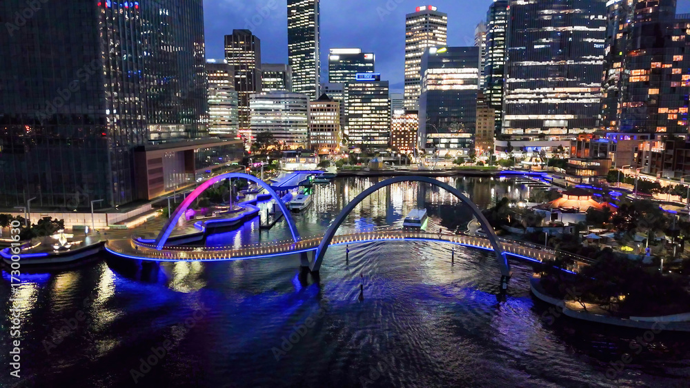 Night panorama of Elizabeth Quay and curved pedestrian bridge in Perth seen from aerial drone