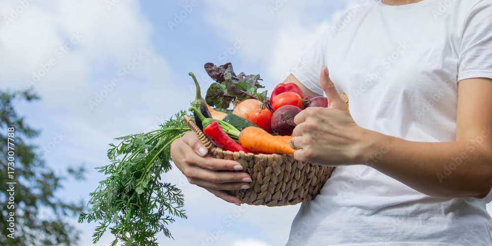 Fresh Harvest from the Garden. Basket of Organic Vegetables in Hands.