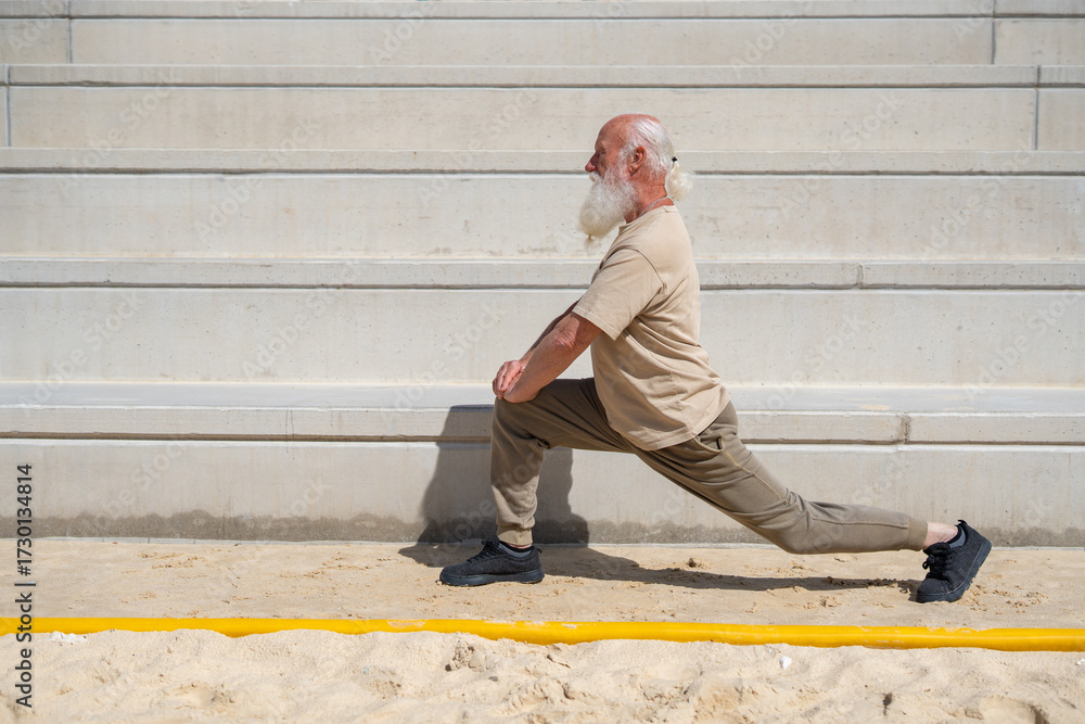Side view of elderly man with long white beard doing lunge exercise on sandy surface in casual activewear, staying fit and strong outdoors on a sunny day with stone wall background.