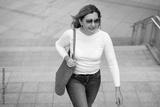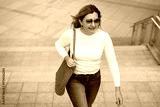 Beautiful mature woman walking up stairs against background of concrete square in city on early autumn day. Front view