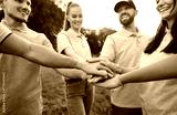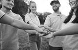 Portrait of a happy smiling young people volunteers in gloves putting their arms in a stack standing in a circle in summer park outdoors. Men and woman volunteering in nature together.