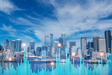 Modern cityscape of a USA skyline with digital data chart overlay concept against a clear blue sky and waterfront background in America.