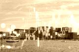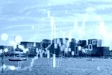 Futuristic financial data visualization overlay on modern USA cityscape with waterfront and sailboats in background, conveying tech economy concept.